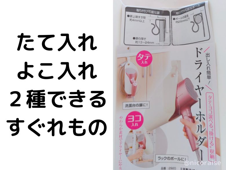 ドライヤーホルダー(inomata製)は、たて入れよこ入れが選べる優れもの。