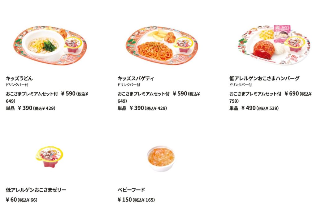 この記事ではファミレスで提供されているベビーフード(離乳食)と、1歳の子でも食べられそうなうどん・おかずなどを紹介しています。おでかけの時の参考になれば幸いです。