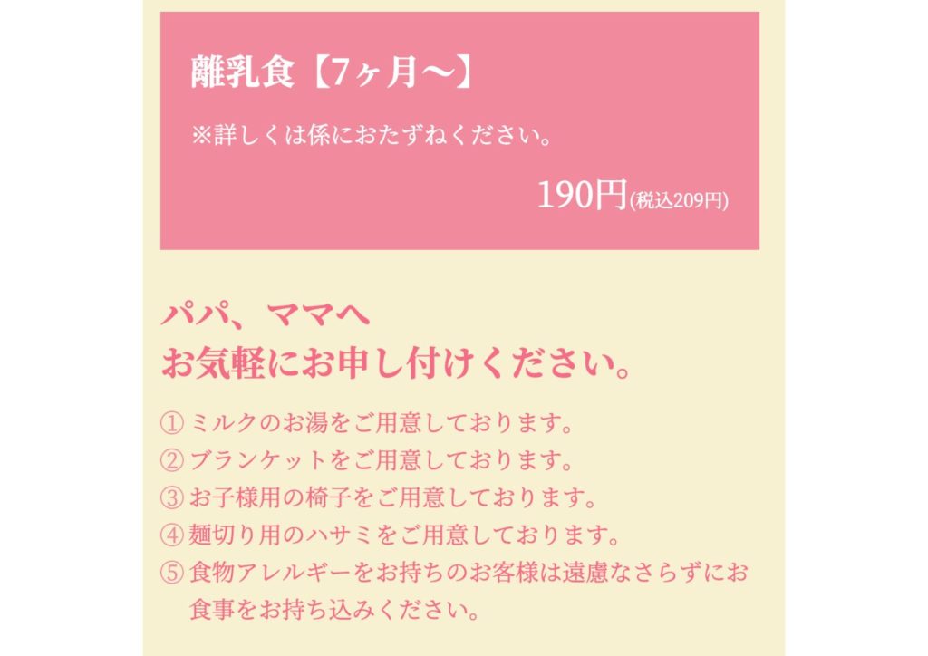 なんとベビーフード無料です。
