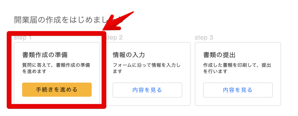 書類作成の準備から「手続きを進める」ボタンをクリックします。