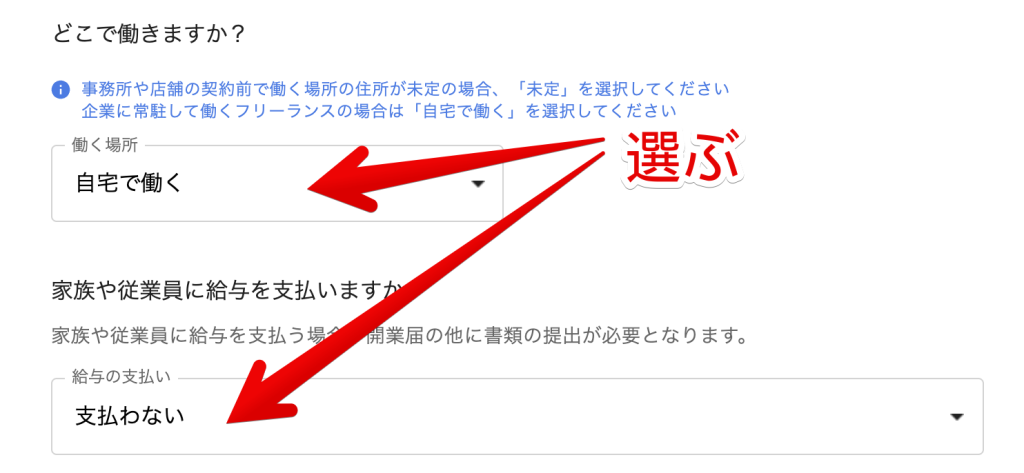 次は働く場所と、家族・従業員への給与支払いについて選びます。