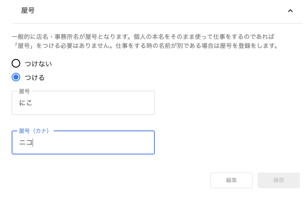 屋号と書くと大袈裟ですが、本名以外で仕事をする場合(ようはペンネーム)はその名前を入力しましょう。