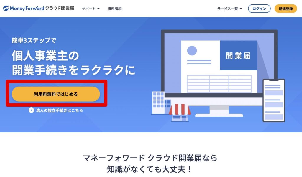 クラウド会計ソフトを選んだら、その関連サービスで開業届などを出します。「マネーフォワードクラウド確定申告」を選んだなら「マネーフォワードクラウド開業届」を、「freee会計」を選んだなら「freee開業」を選ぶといいでしょう。