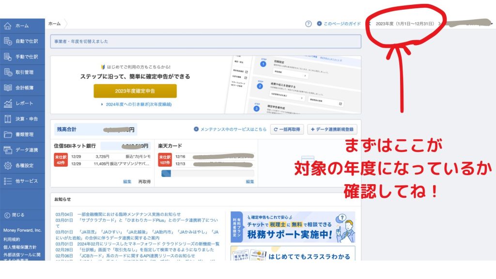 マネーフォワード確定申告にログインし、トップページを表示します。