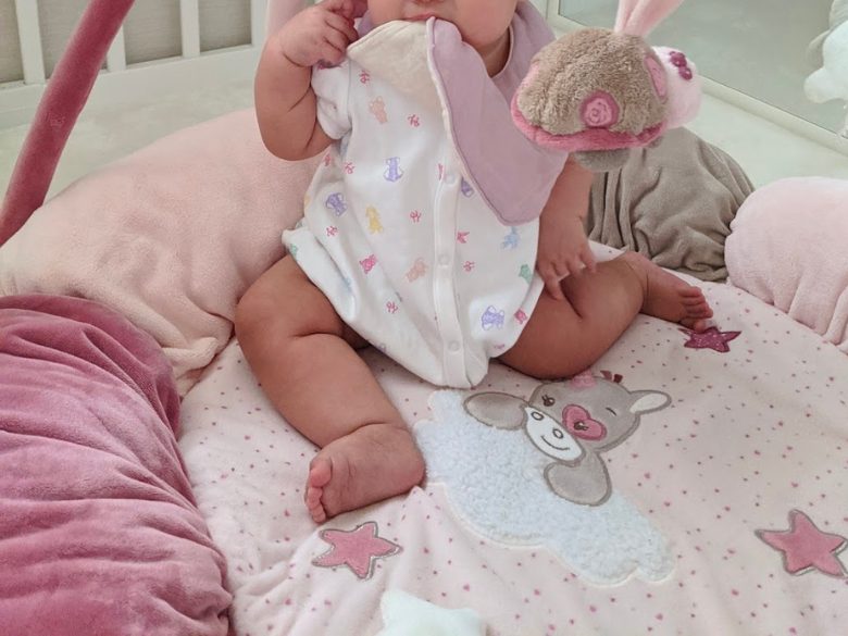 0〜2ヶ月まではあんまりプレイジムを使わなかったのですが、3ヶ月過ぎたあたりから、ジムについた鈴を鳴らしたり、付属のぬいぐるみで遊んだりするようになりました。