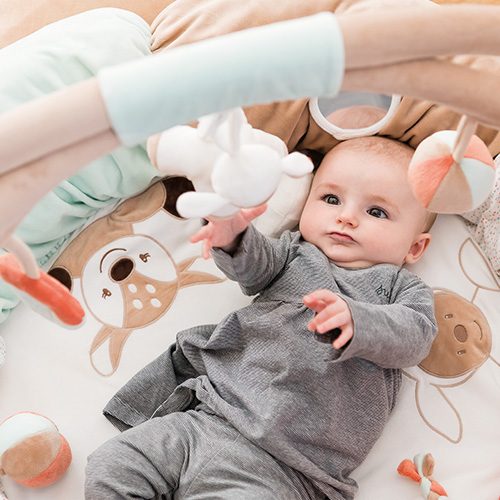 知育につながる鈴や鏡もついていてネンネ期の赤ちゃんから、1歳を過ぎた子どもまで楽しめます。