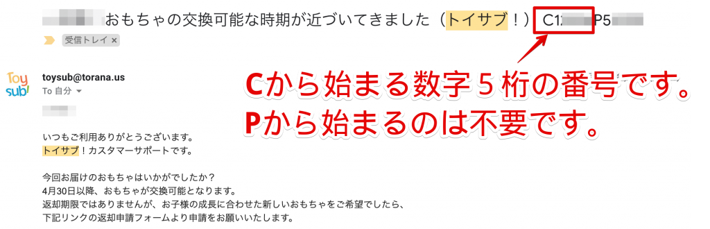 顧客番号はトイサブのメールのタイトルについています。「C+数字5桁」の番号です。